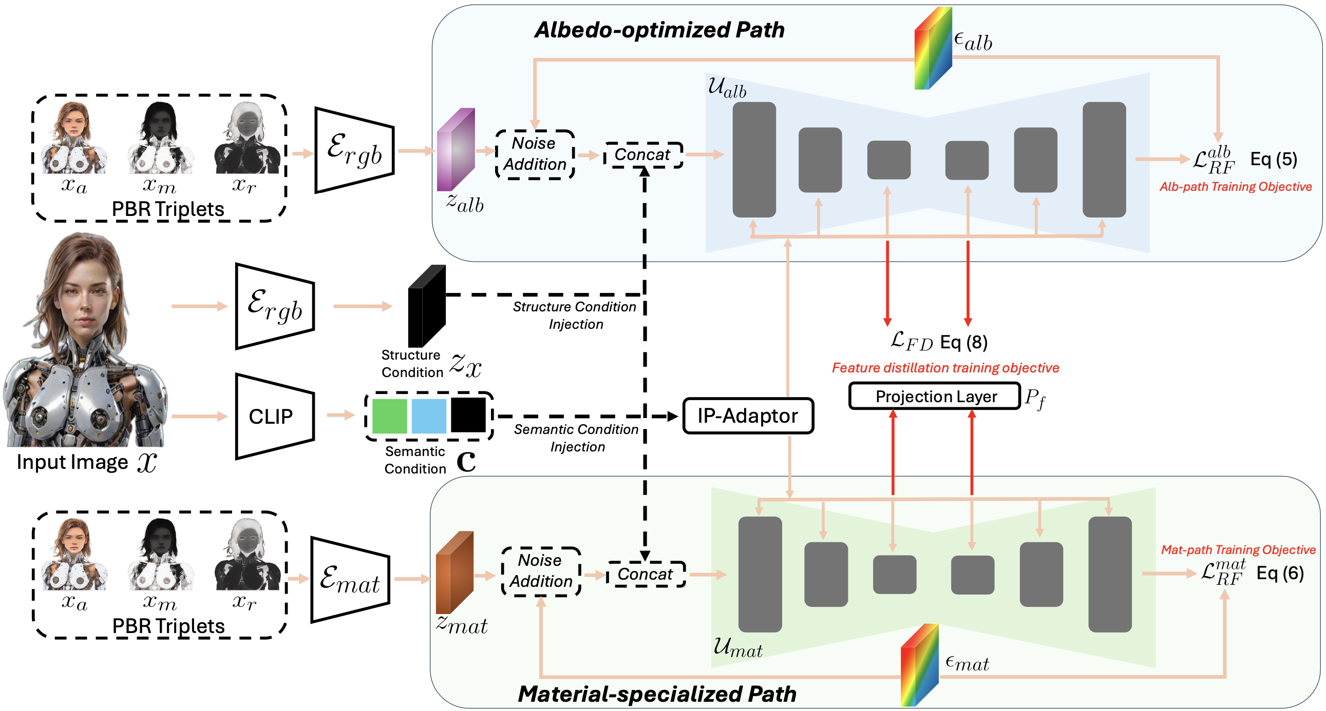 DualMat's training architecture with dual paths and feature distillation. The albedo-optimized path (top) and material-specialized path (bottom) are trained with rectified flow objectives while maintaining consistency through feature distillation and dual conditioning mechanism.